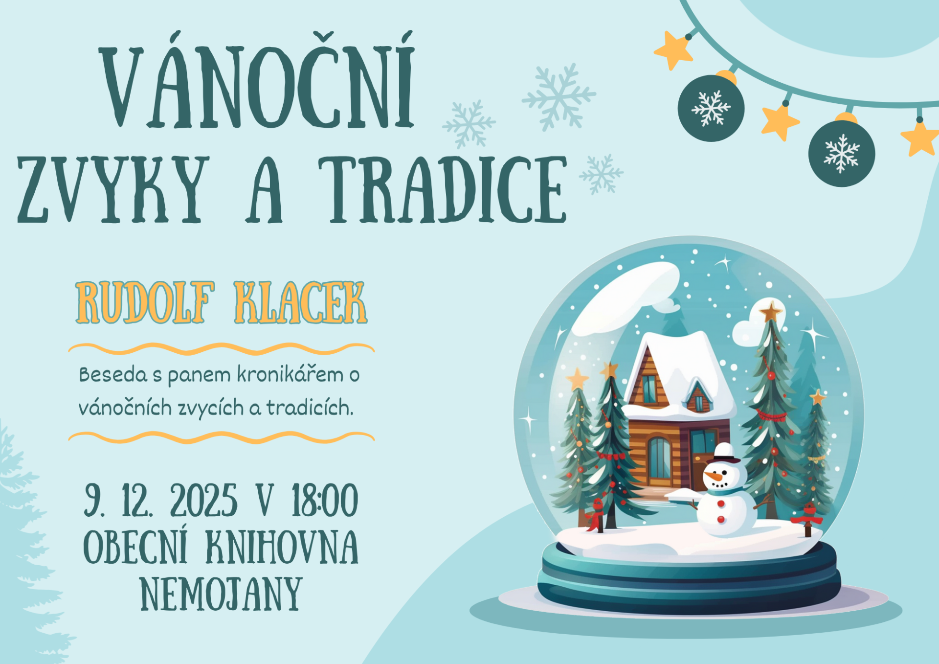 Obecní knihovna Nemojany zve na besedu s panem kronikářem o vánočních zvycích a tradicích.